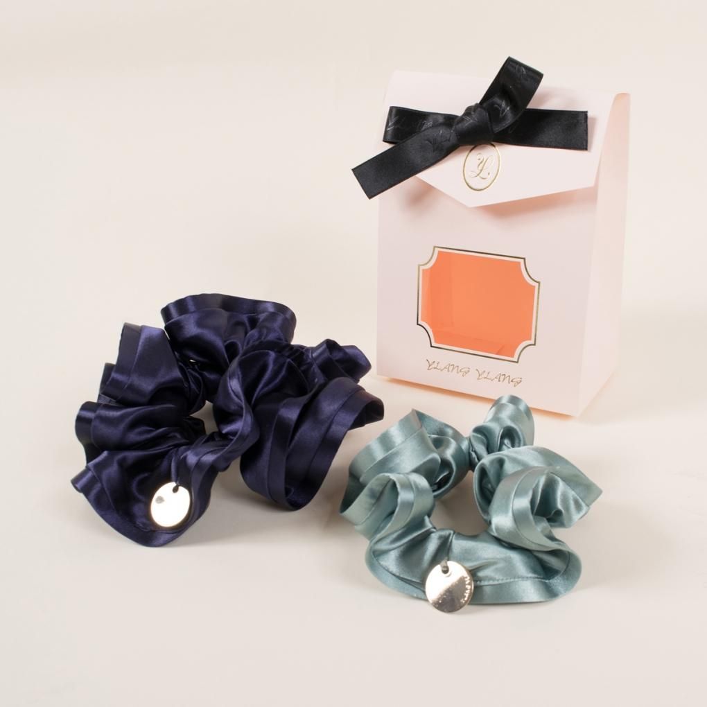 2種の光沢のあるサテン地で上品に仕上げたシュシュ。