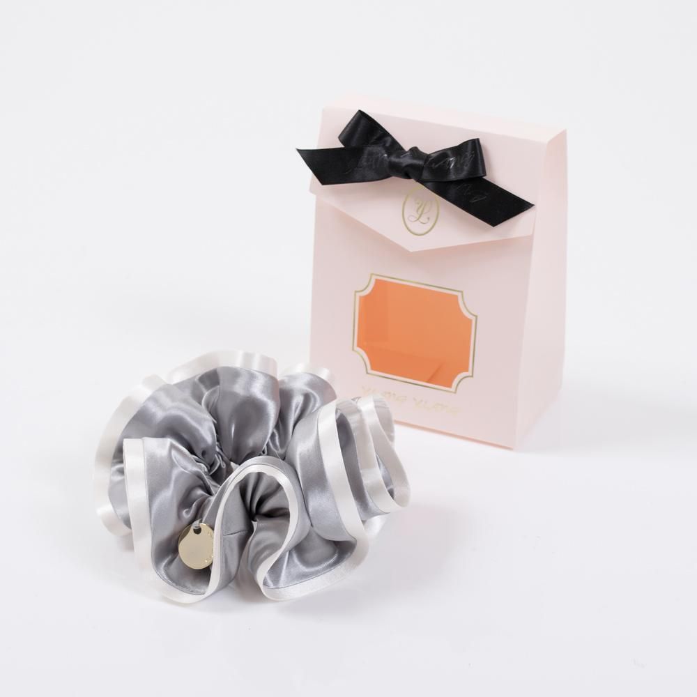 2種の光沢のあるサテン地で上品に仕上げたシュシュ。