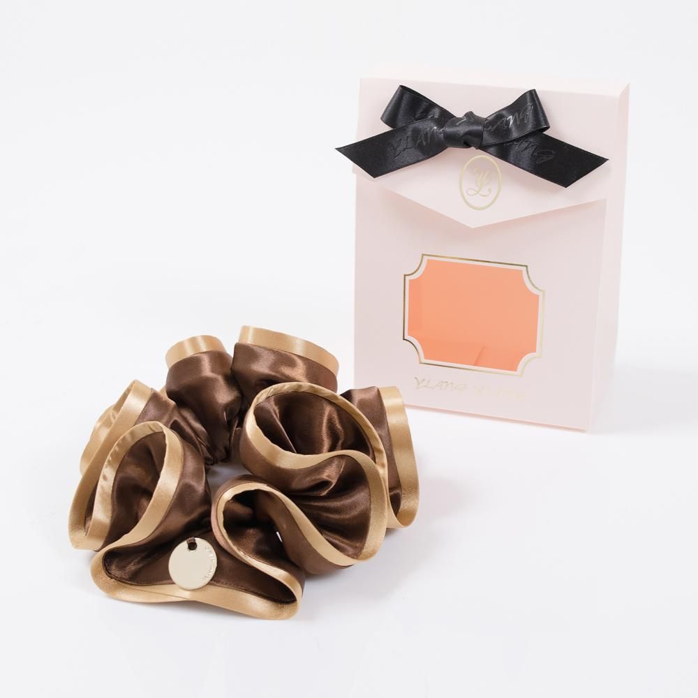 2種の光沢あるサテン地でエレガントに仕上げたシュシュ。