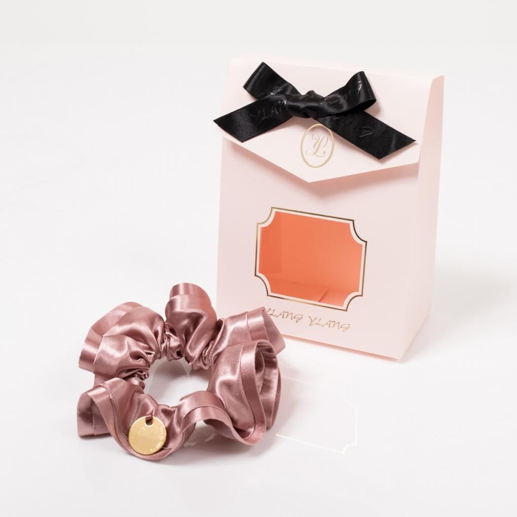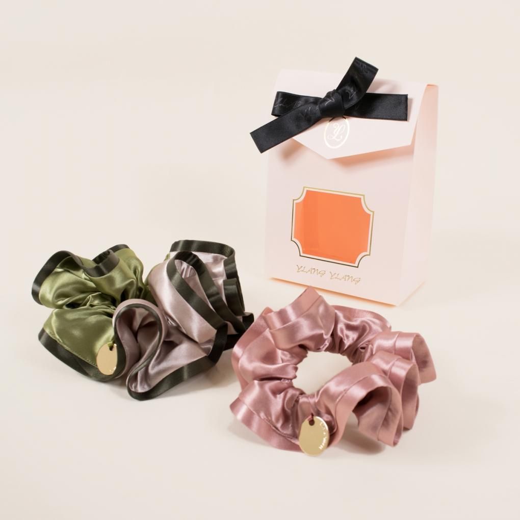 2種の光沢あるサテン地でエレガントに仕上げたシュシュ。