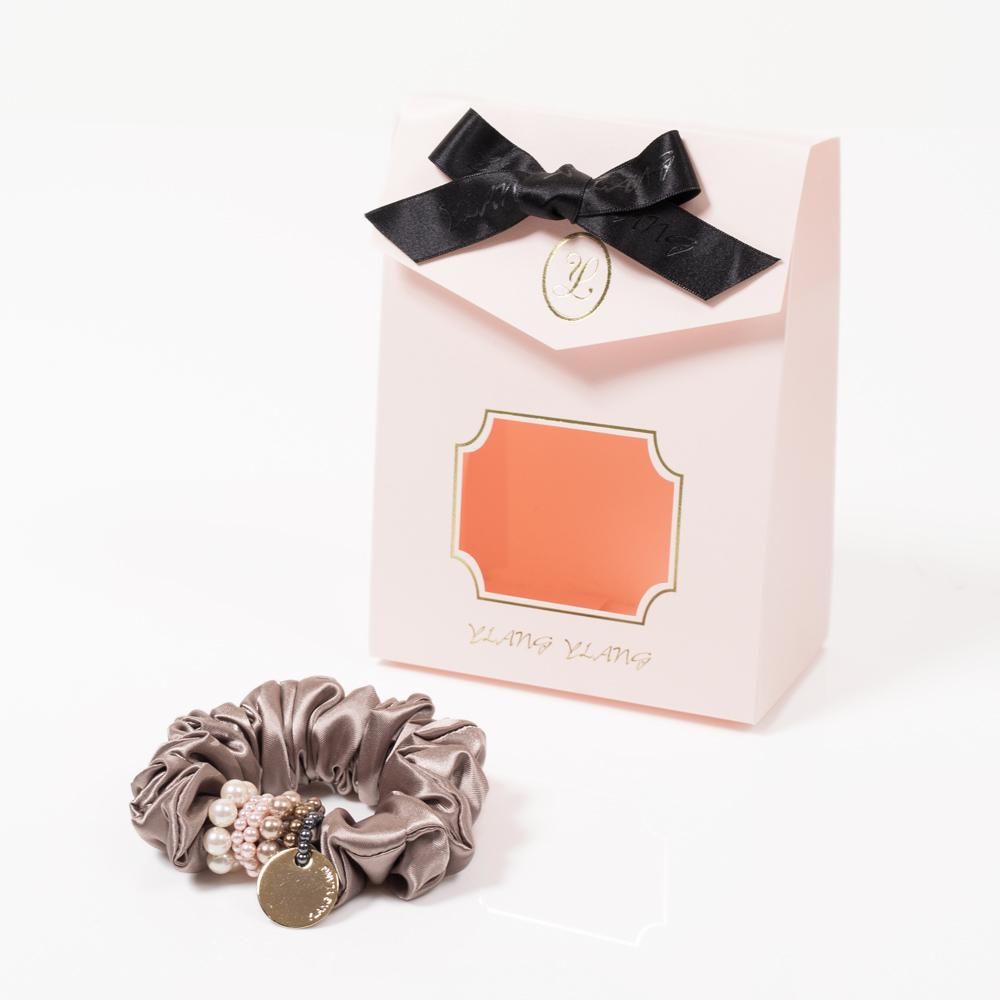 2種の光沢あるサテン地でエレガントに仕上げたシュシュ。