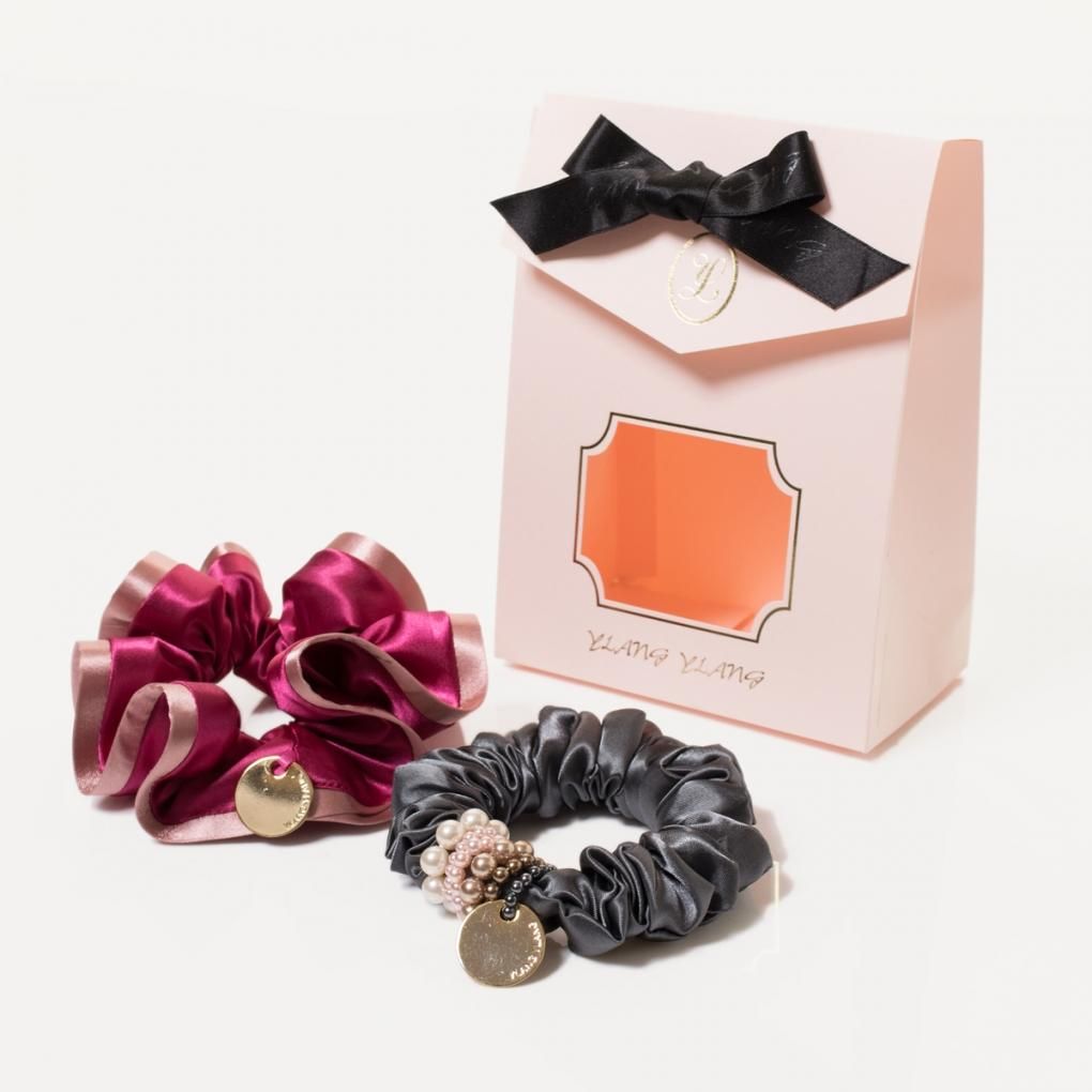 2種の光沢あるサテン地でエレガントに仕上げたシュシュ。