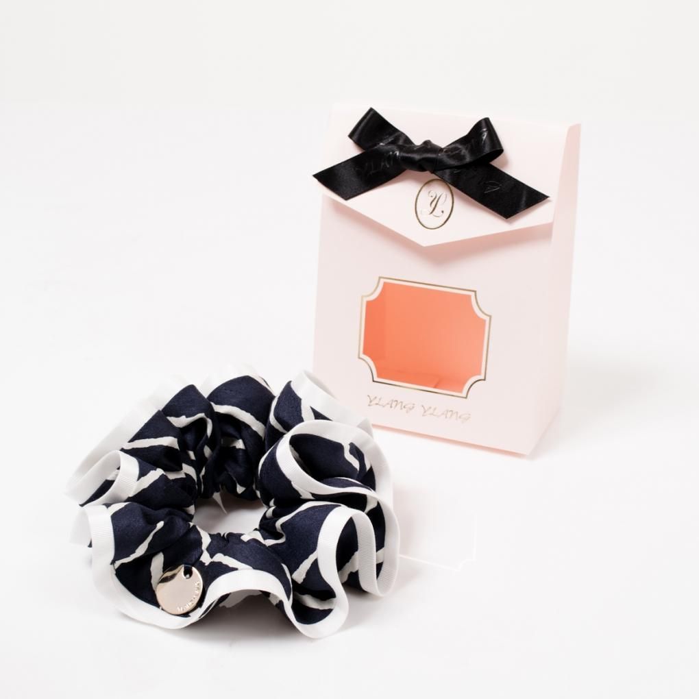 2種の光沢あるサテン地でエレガントに仕上げたシュシュ。